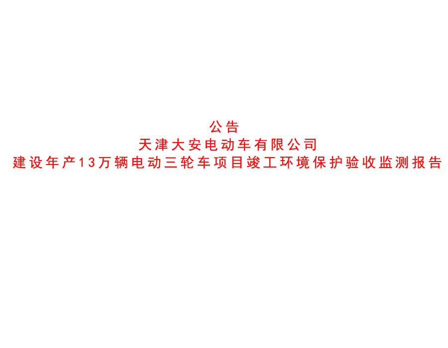 公司動(dòng)態(tài) 天津大安電動(dòng)車有限公司建設(shè)年產(chǎn)13萬(wàn)輛電動(dòng)三輪車項(xiàng)目竣工環(huán)境保護(hù)驗(yàn)收監(jiān)測(cè)報(bào)告